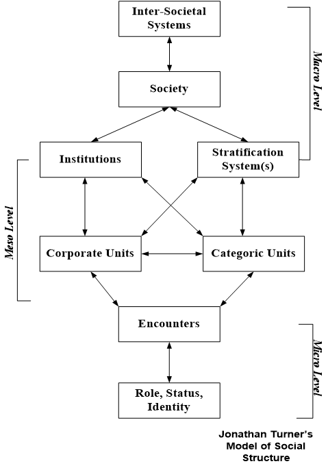 At this point, the strategy revolves around building coherence in your syllabus. This is the most theoretical task of the theorist. The teaching-by-theorist method or hybrids are not really intellectual labor, but rather the realization of dispositions long internalized in our sociological habitus. Deciding, as a scholar, what the social world looks like from your vantage point and then executing that vision through the careful curation of texts designed not to push a theorist or tradition, but to realize the vision is an art and science. Again, some of this will be constrained by the choices made in Step 2, and of course, Step 1. But, I think besides a few alternatives, I do not know of a better approach to connecting the readings to your own thinking to the discipline at large. Students will SEE this, and I will offer a money-back guarantee that they will respond to this (though, maybe not the first time you try this as there will be kinks you cannot predict just like any course development or revamp inevitably produce). I’ll give a short example of one strategy I’ve used in the past. The figure directly below this is borrowed from Jon Turner’s theory textbook. It is a simple heuristic device that visualizes the levels of analysis.